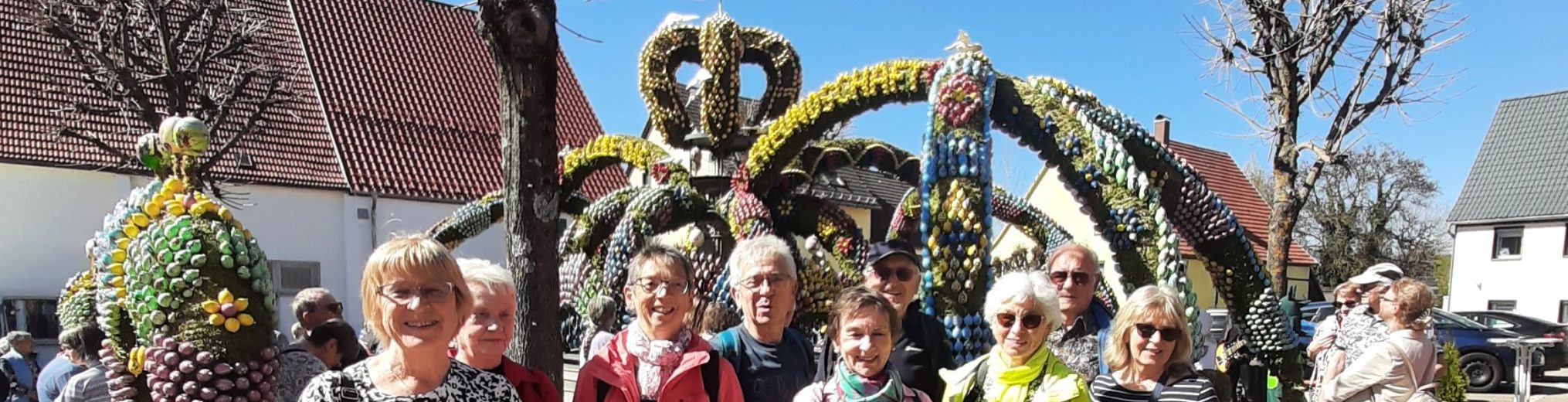 Neun Wanderer haben sich am Mittwoch eingefunden, um vom Federbachstausee in Horn, einem von elf Stauseen an der Lein, nach Schechingen zu wandern. Dort ließen sich zunächst alle Kaffee und leckere Kuchen schmecken, um dann anschließend den wiederum sehr besonderen Osterbrunnen zu bestaunen. Der Brunnen gilt als einer der schönsten in der Umgebung und ist mit ca. 13 500 bemalten Straußen-, Gänse, Enten-, Hühner- und Wachteleiern wohl auch der aufwendigste. Es ist erstaunlich, mit welcher Genauigkeit und Ausdruckskraft die Motive aufgetragen wurden. Dieses Jahr waren zusätzlich zu den sonst schon bekannten Motiven eine große Anzahl von Tieren der Wilhelma zu bewundern. Nach diesen Eindrücken ging es wieder zurück nach Horn, wo auf dem Weg außer Alpakas auch der gesamte Albtrauf vom Braunen Berg bis zum Hohenstaufen zu bestaunen waren.